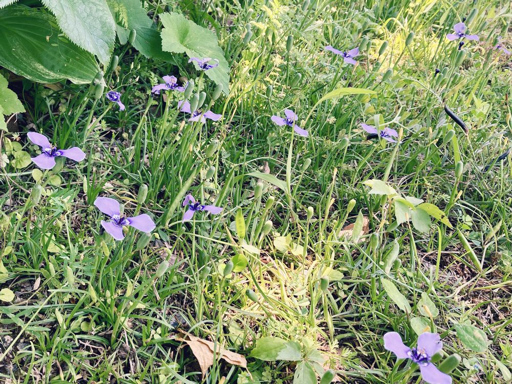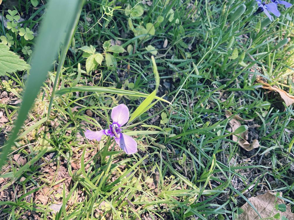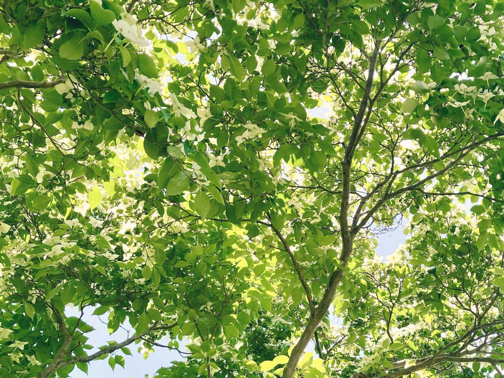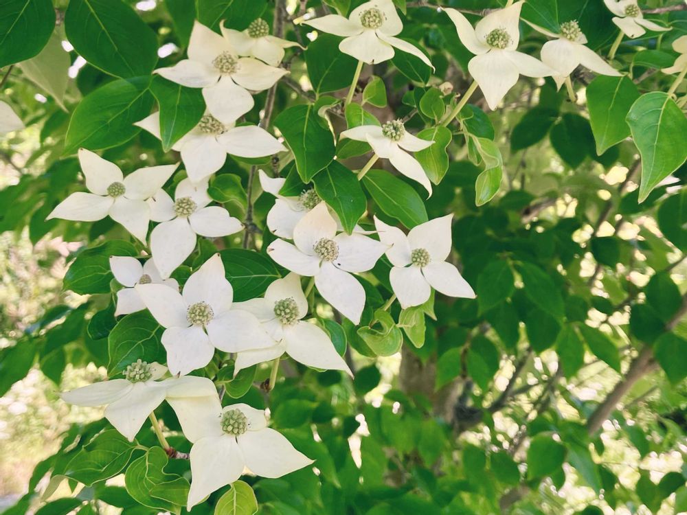 目線ヤマボウシの白が美しくて見上げるとヤマボウシの大きな🌳に守られて、足元にはcuteな紫色のチリアヤメさん✨木漏れ日の中に咲いていました…