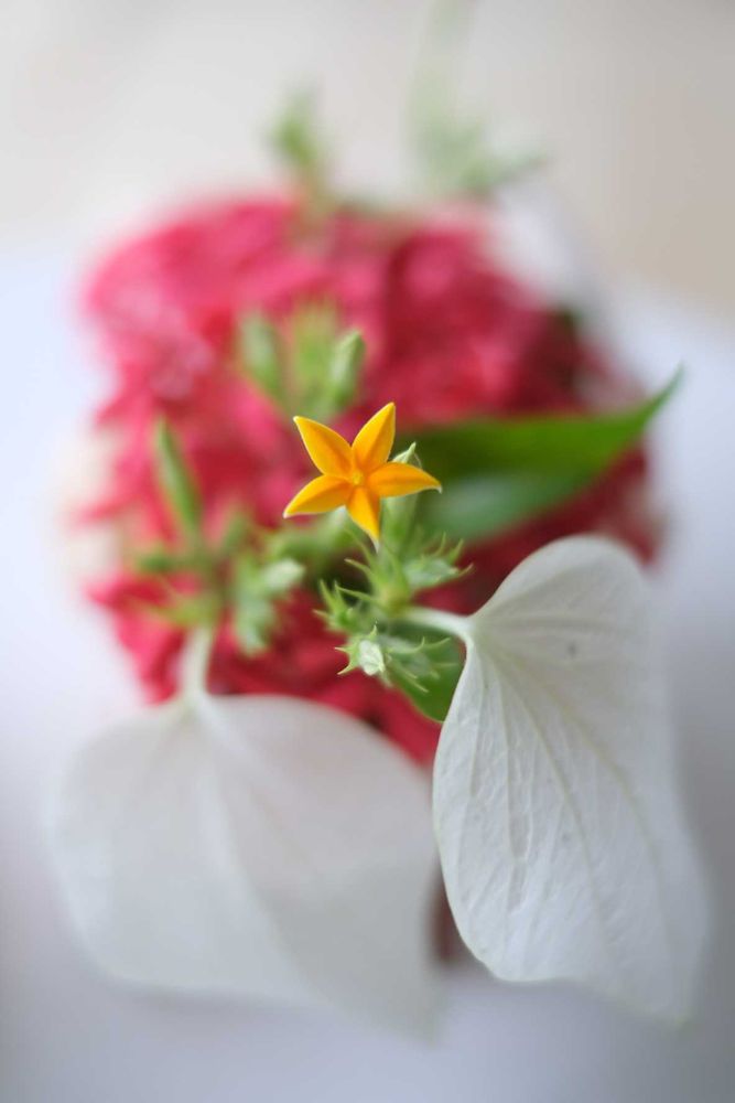 シャコガイの器にサンタンカとコンロンカのかわいらしいアレンジ。昨日はぜんぶツボミだったコンロンカ、今朝は小さな黄色い花が咲いていました。