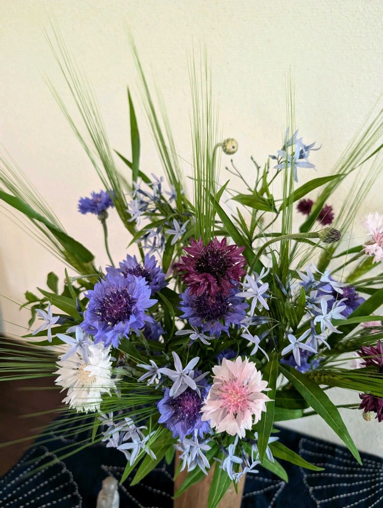一束が100円のいろんな色の矢車菊と50円の麦で楽しい花遊びでした💜💚🩵