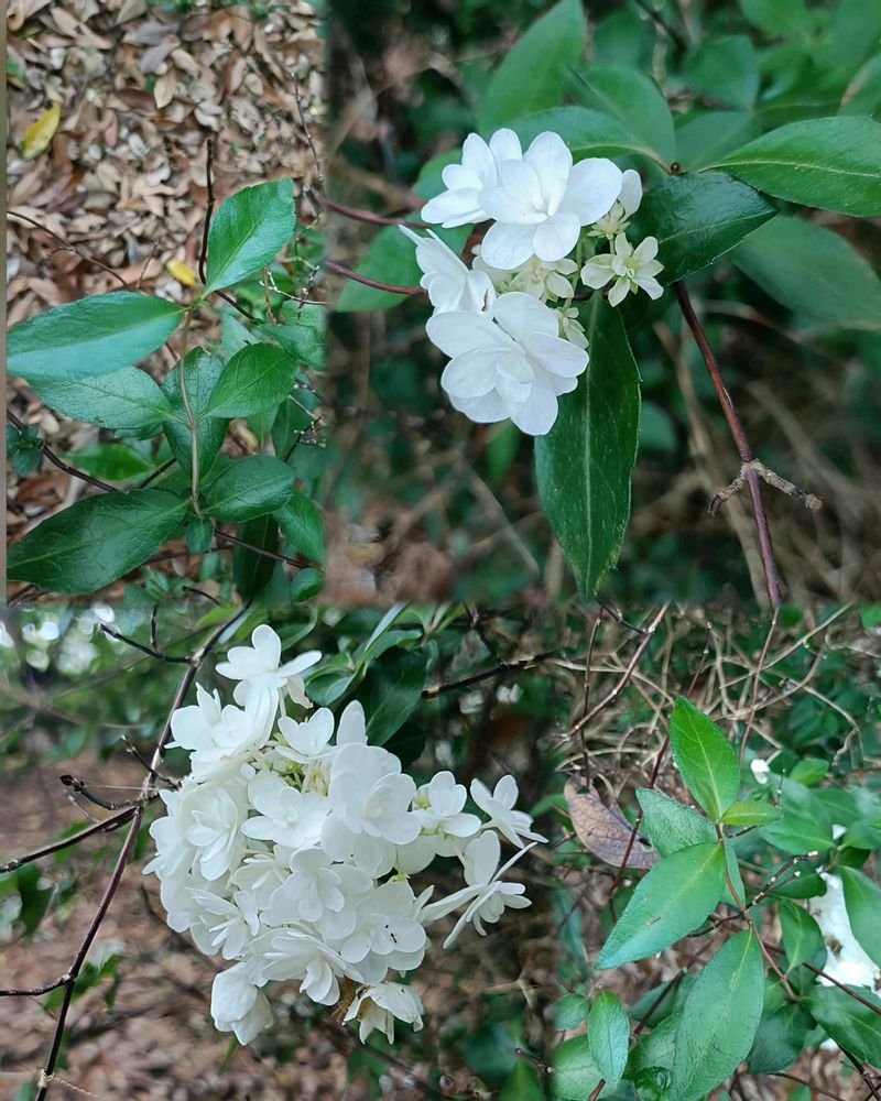 八重咲きのコガクウツギ。大木の株元に一際目立つ紫陽花のようなお花。よーく見ると葉が違う🧐 細い枝は半蔓状に伸び、全体的に清楚な印象でした😌✨️