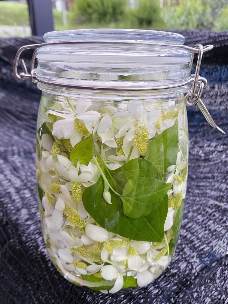 消毒した瓶🫙とかに摘んだ花を入れてアルコールを入れます(私は35℃のウォッカを使っていますがホワイトリカーを使う人も多いみたいです)