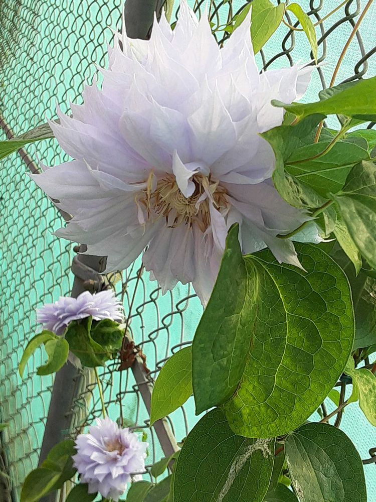 公園の野球場フェンスにクレマチス、初めて見る軟らかな色合いで花びらがふわふわ気持ち良さそうでした💞😊