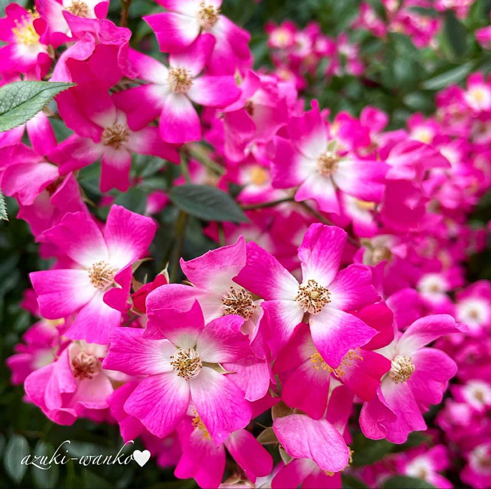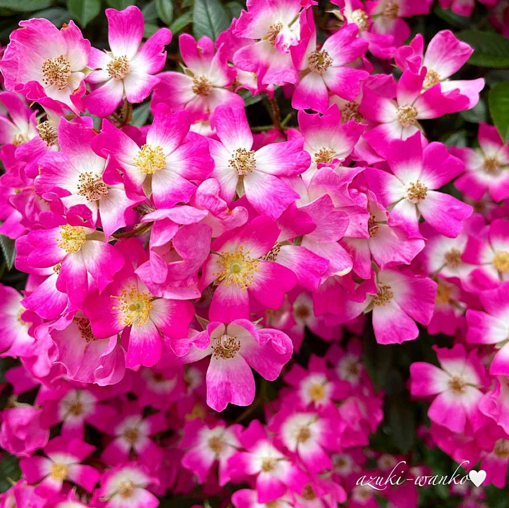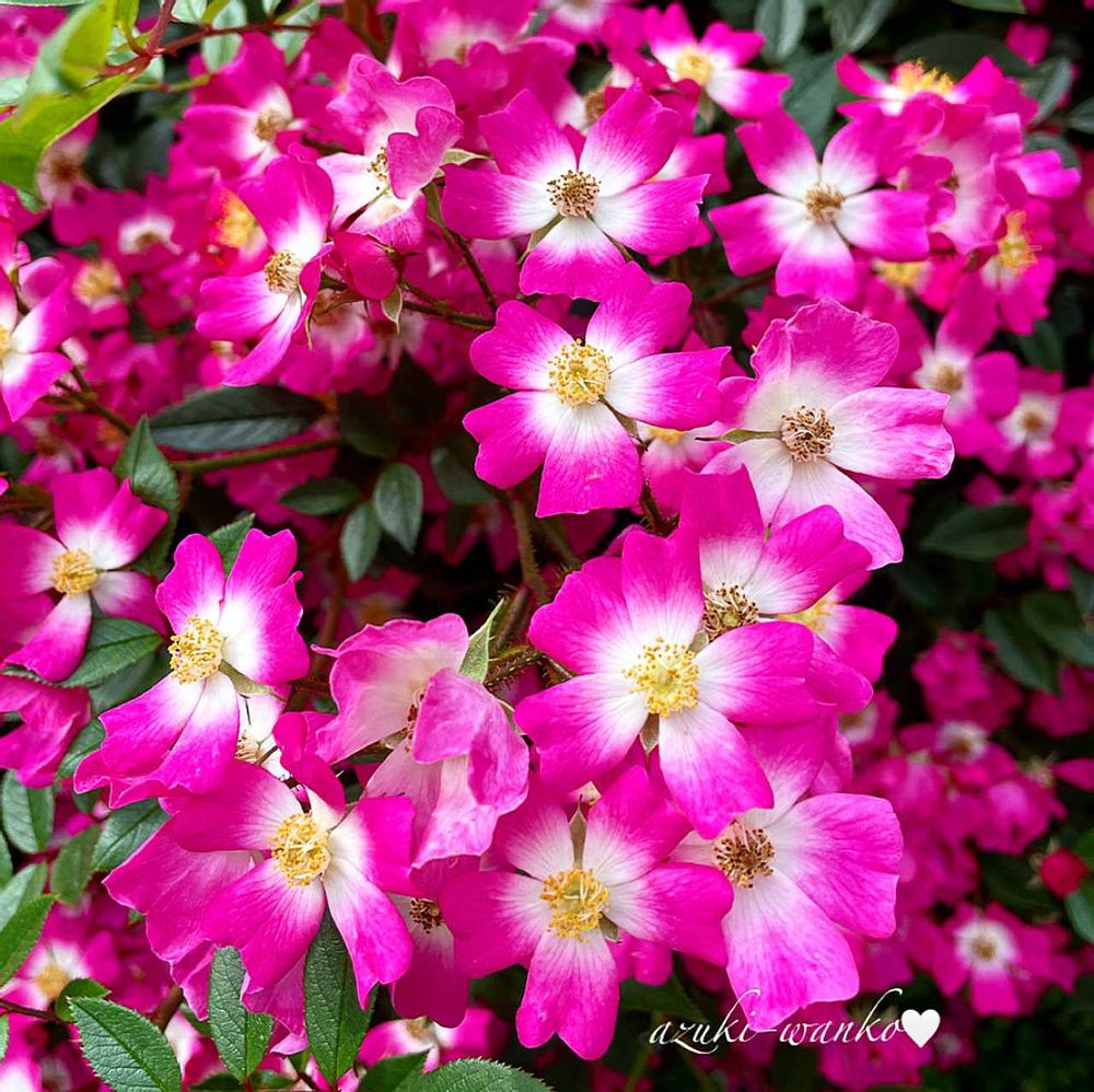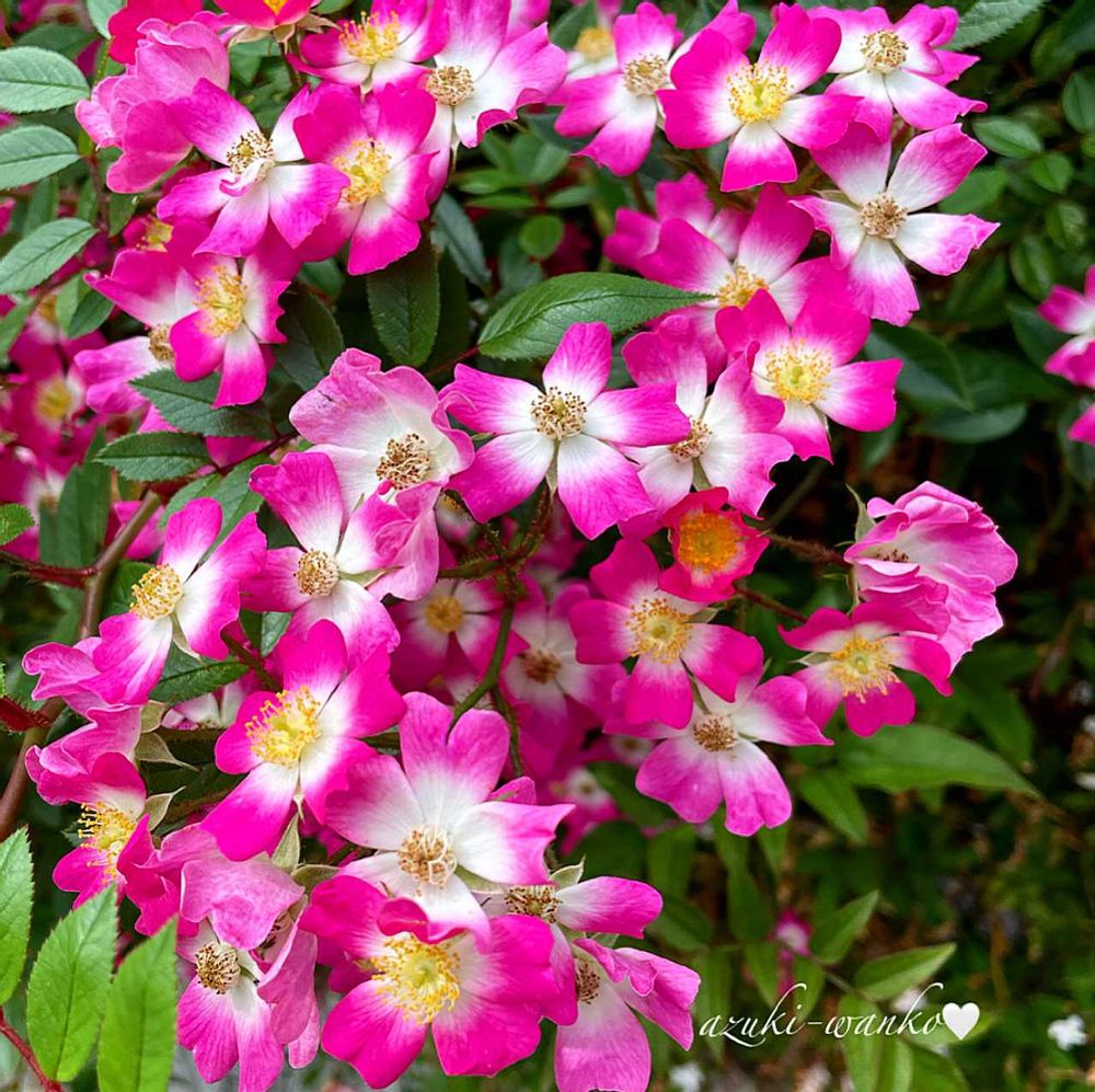 モーツァルト(Mozart)は、小輪一重咲きのハイブリッド・ムスク(HMsk)系統のバラです。濃いローズピンク色の花弁の弁底が白く、大きな房咲きになります。