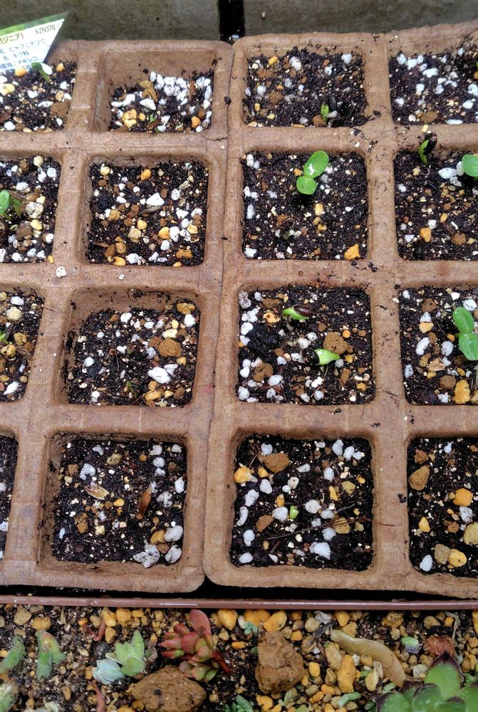 ⑤ミニひまわり🌻と黄緑色の丸いジニアの芽が出てきました🌱。