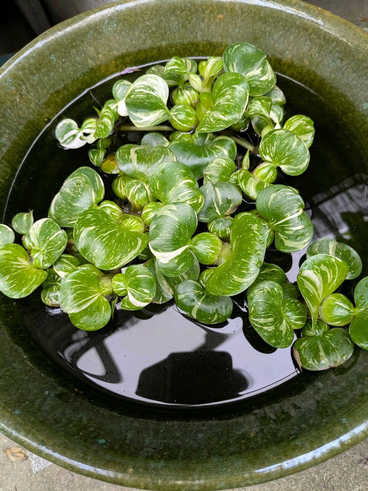 ホテイアオイの斑入り 旦那さんが気に入ってお迎えしたんですよ🎶 かなり増えて来ました🤗💓 メダカさんに かくれんぼ されちゃいました〜ꉂ🤣𐤔