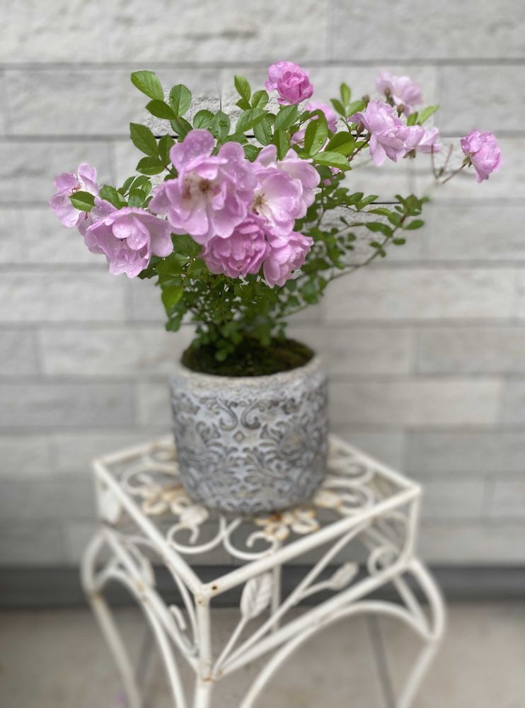 最後のブリキの鉢は実生のスイートチャリオットさん。花びらが🩷で散ってもかわいい💕