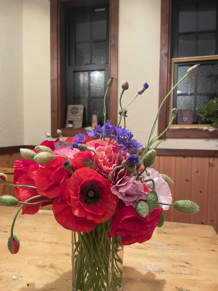 鮮やかな赤いポピーと真っ青な矢車草の花束💐この前 猫散歩の途中に公園で偶然、お花の摘み取りやってました☺️ポピーは猫に有毒らしいので、届かない安全な場所に飾りました。