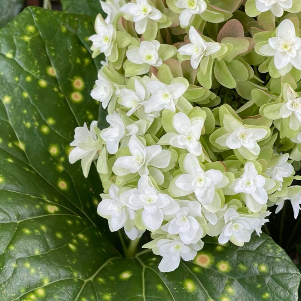 西洋アジサイの「ハイドランジア」と斑入りのツワブキ(石蕗)の葉っぱ