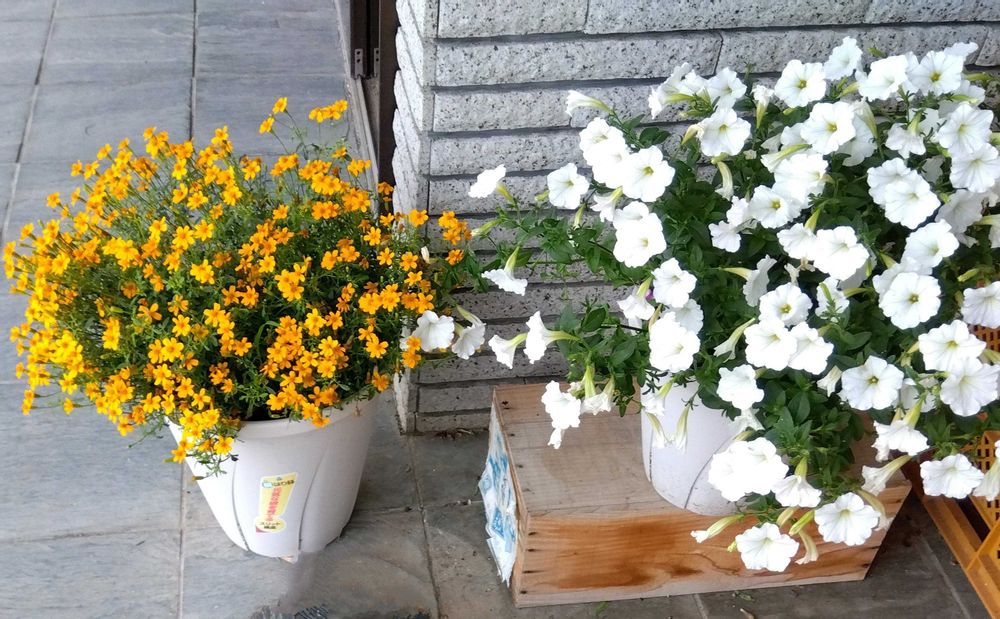 ビスタスノーの中心のイエローカラーとリンクコーデで10号の根はり鉢に二株植えのタゲテスゴールドメダルを入口脇にしたら、出入りする度にシトラスミントの香りを楽しみたくなる♡