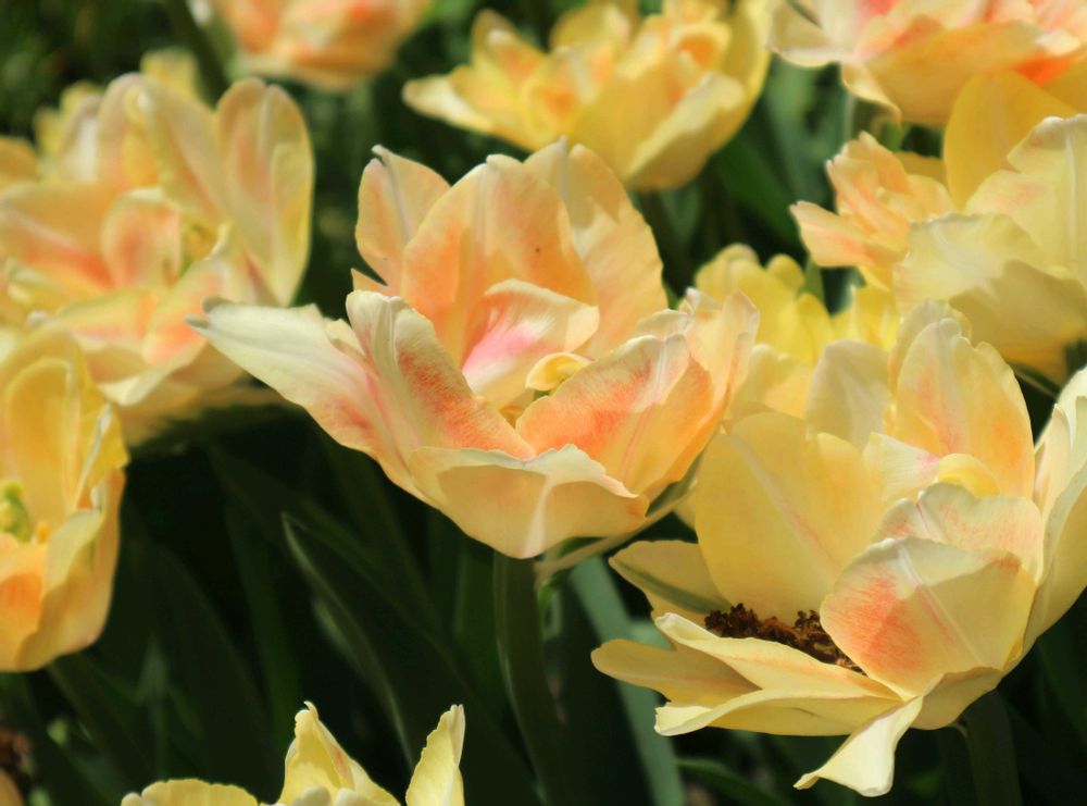 鮮やかな黄色で咲き始め、少しずつピンク色が入りはじめて、アプリコット色に変化するチューリップ 🌷