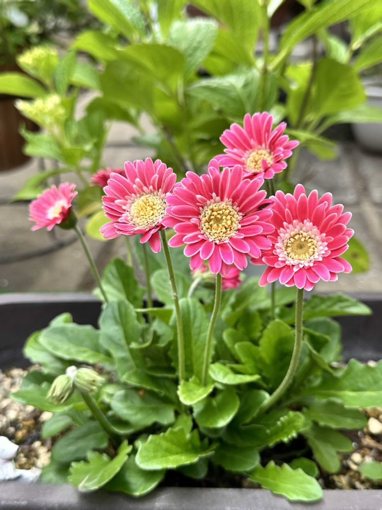 仲良しさんのように勢揃いで咲いてくれたガーベラは、花茎が次々と上がって只今6本のお花が咲きました。