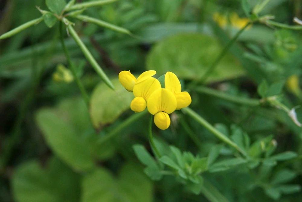 セイヨウミヤコグサとの違いは花柄の先に咲く花の数、茎や葉の毛の有無。