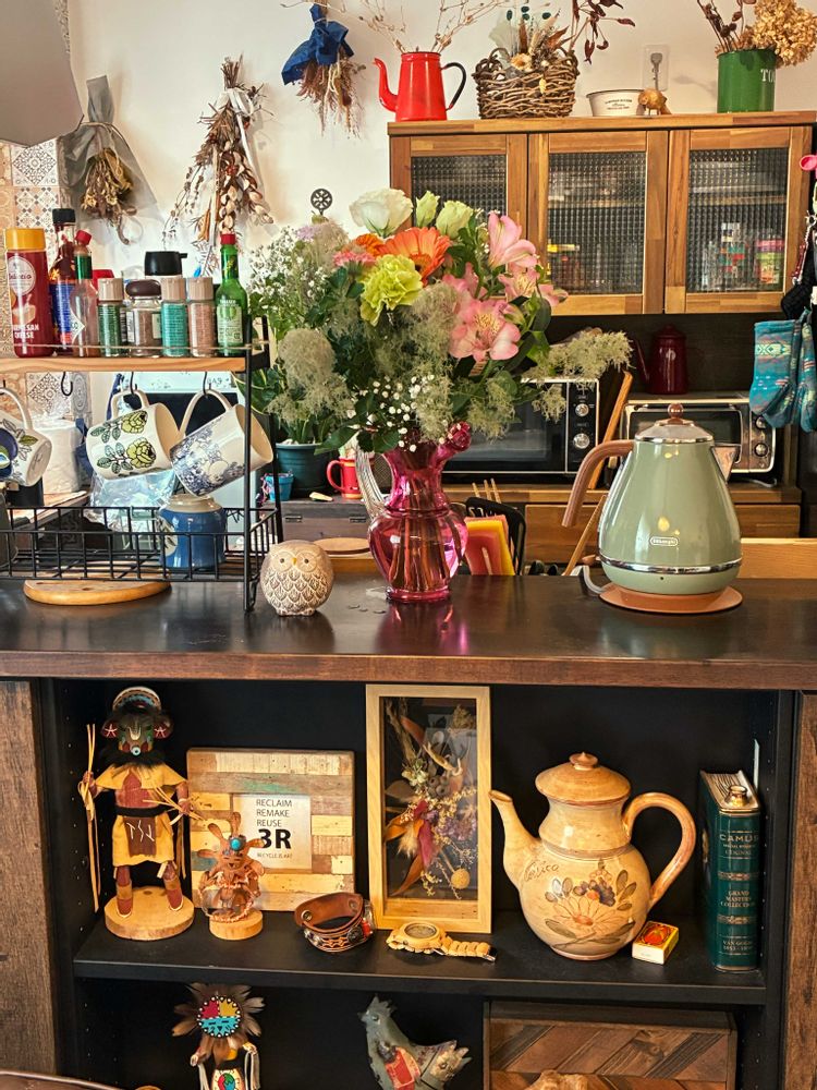 妻が教室で初のオールラウンドブーケ作成💐リビングが華やかになりました😆✨