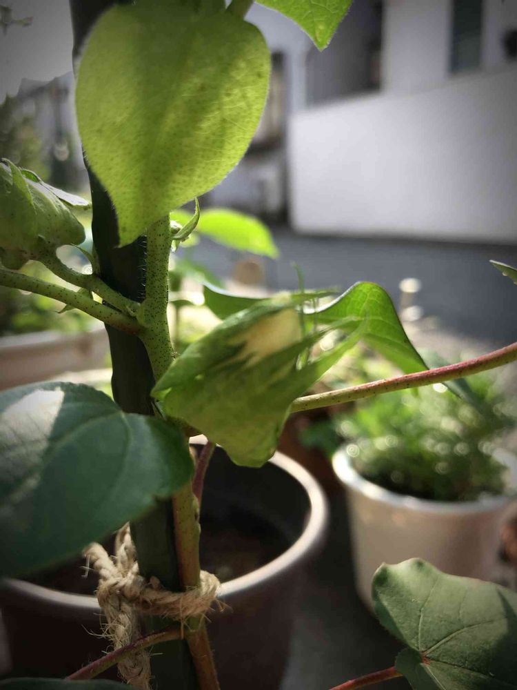 コットンの蕾が膨らんできました!週末あたりには咲くといいなぁ。同じ木⁈あと2つ蕾が出来ているので、楽しみです(^^)