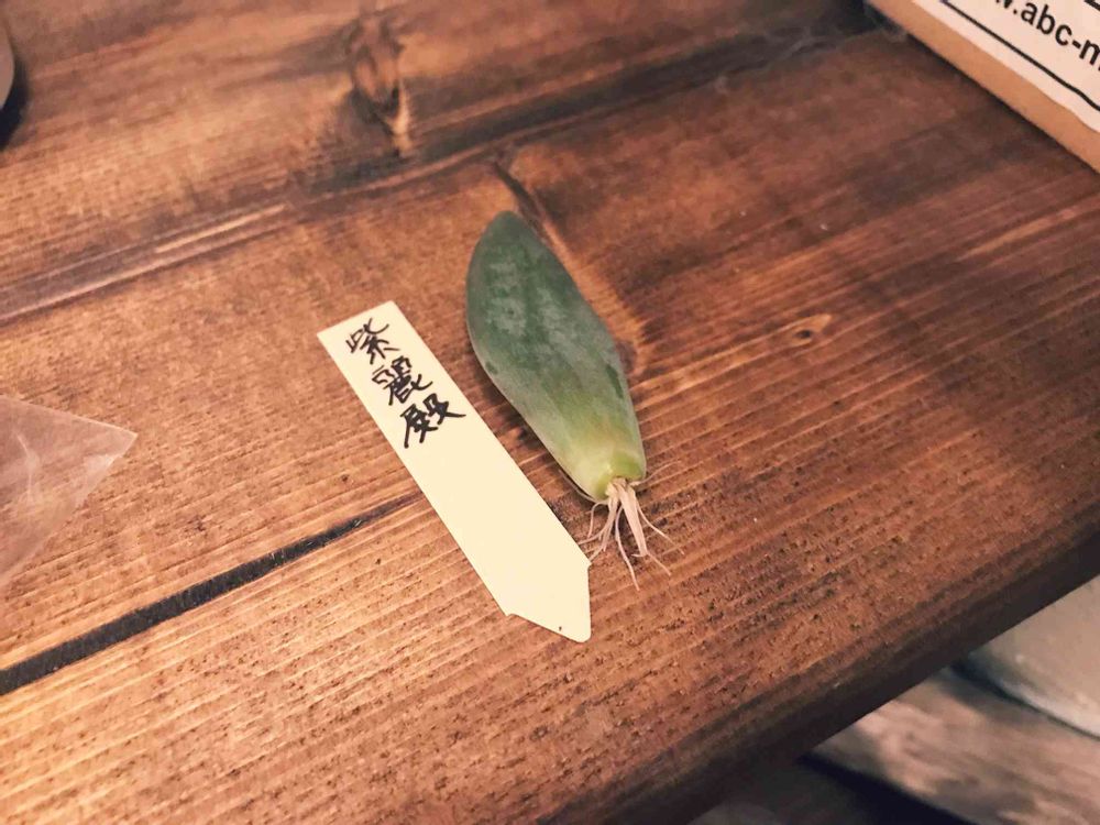 去年の冬に生まれて初めて買った多肉、紫麗殿の葉挿しが発根!😂