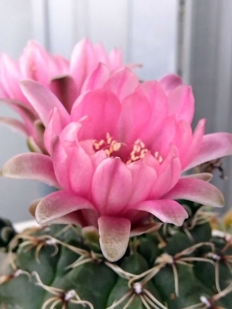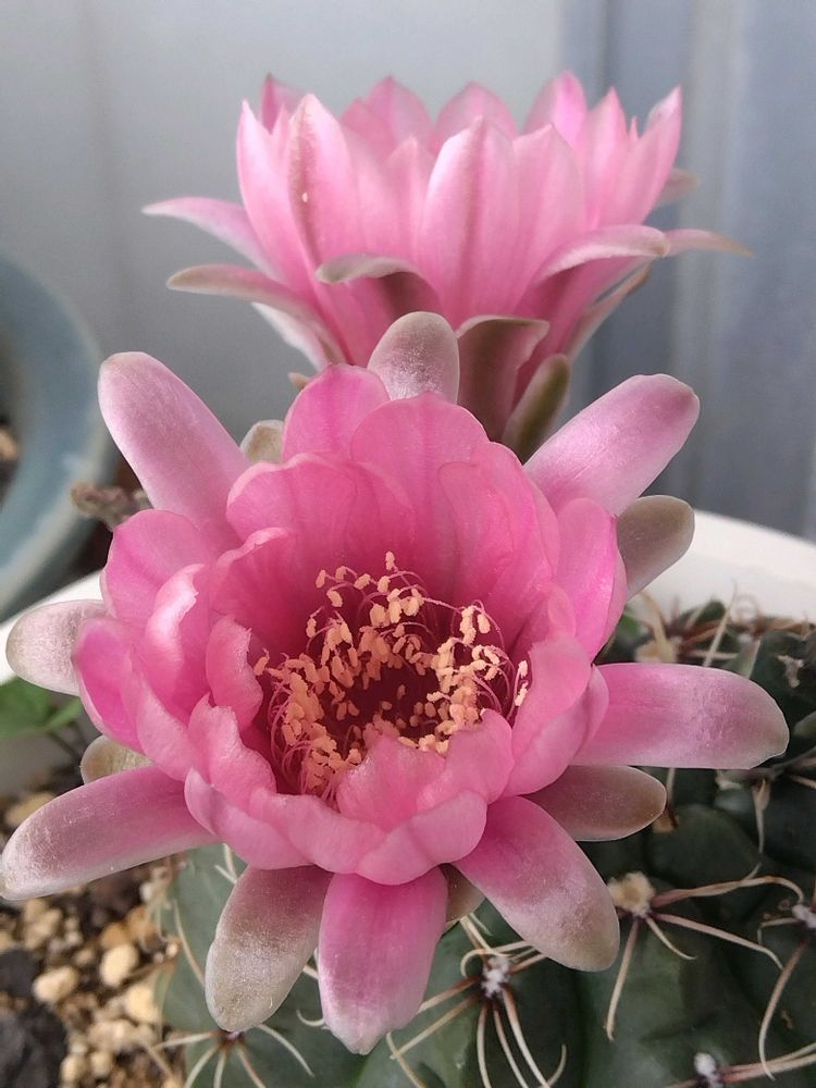 ①②ダイソーで買った緋花玉が同じようなピンクの花です🌵🌸😅