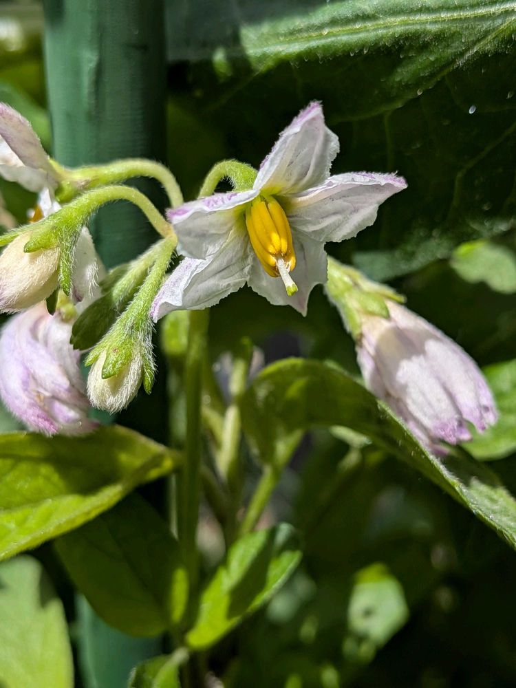 ペピーノが開花しました。トマト🍅とバジルと寄せ植えするという暴挙に及んでいるので、どのくらい大きくなるかは不明です。