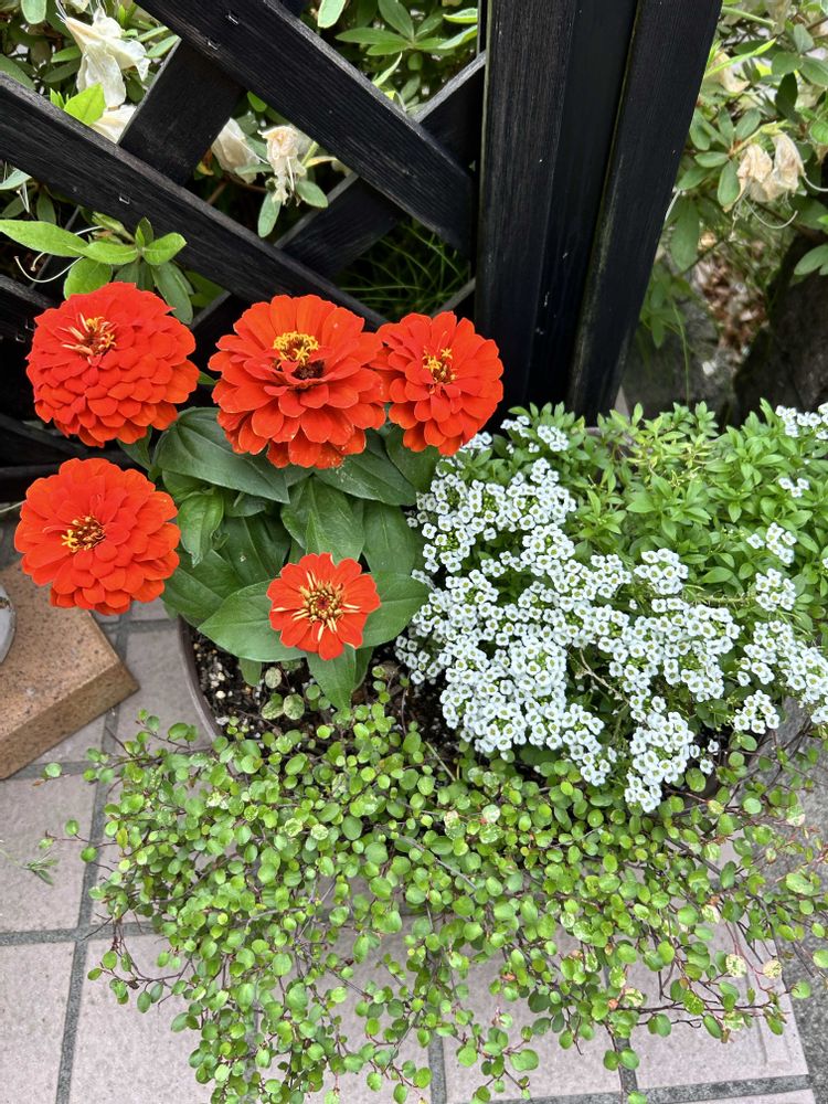 ジニア プレシオーサ🧡を植えました。アリッサムとワイヤープランツがワサワサでそのままで