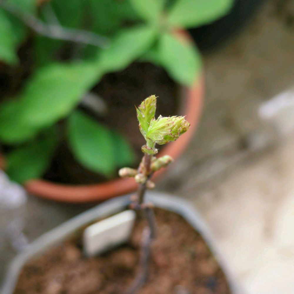 全然目が出ないピンオークが一鉢あったのですが、ようやく萌芽しました。