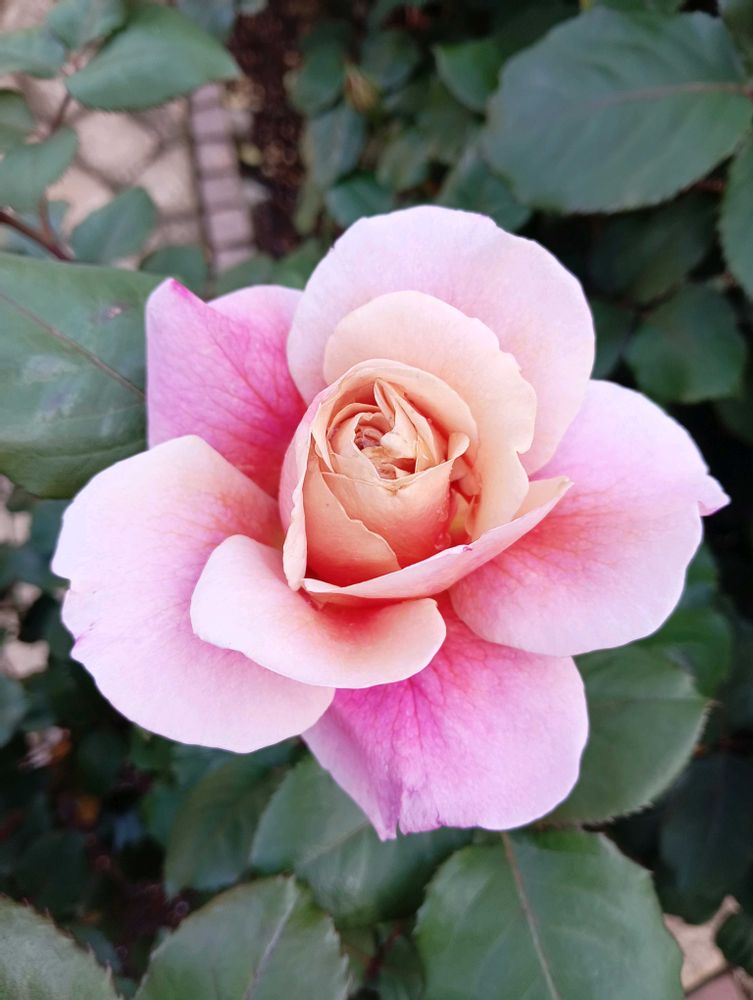 アプリコットベージュをベースに、外側からラベンダーピンクを帯びるグラデーションが美しいバラです。育てやすさは普通。鉢植え向きです。