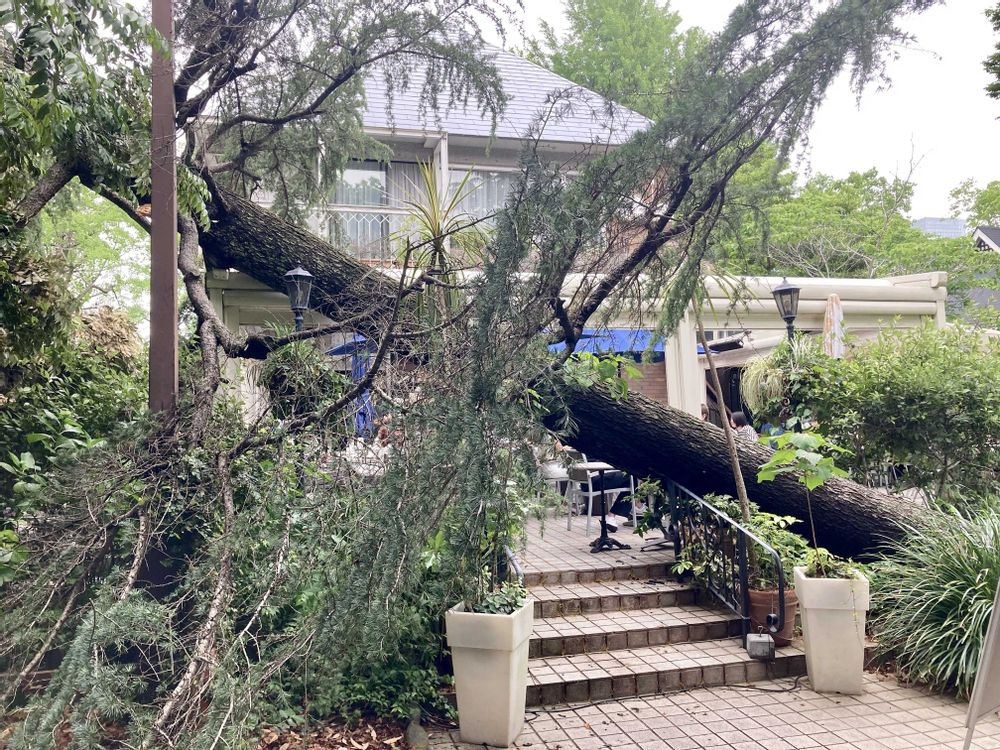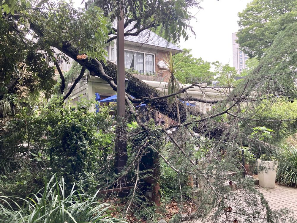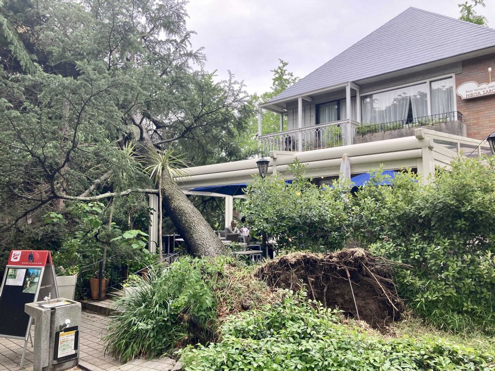 日比谷公園の老舗ビアテラス"日比谷サロー"の入口に植えてあった「ヒマラヤスギ」が昨日の強風雨でなのか?無惨に倒れてた。