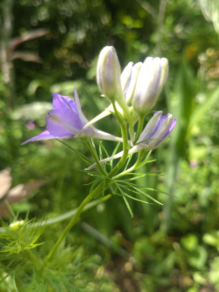 雨☔風🌀に負けて?倒れたり曲がったりの庭のチドリソウ(千鳥草)です