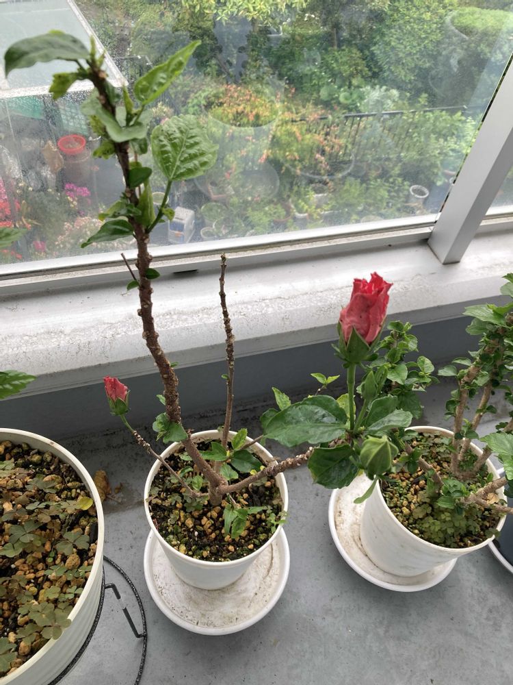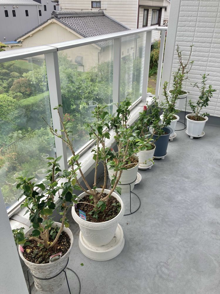 ベランダのハイビスカス🌺 咲いてくれるのか心配です 葉っぱが出てきた鉢も アブラムシが沢山付いてしまって 今日必死に退治して 薬を撒きました🤣🌺