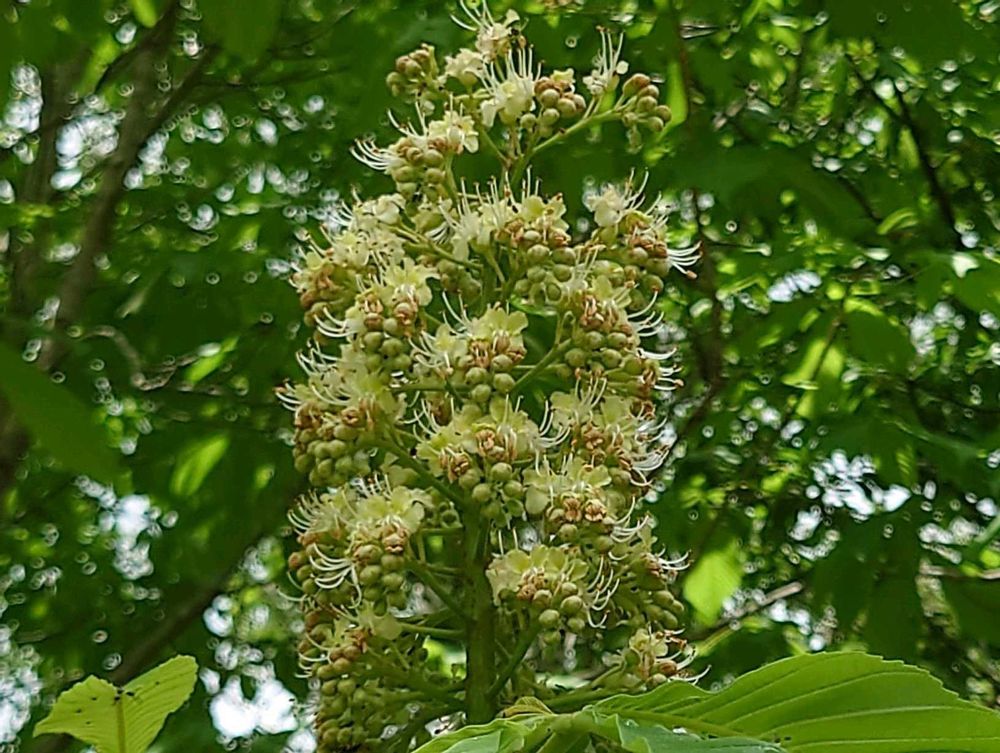 枝先につく円錐花序に雄花と両性花が混ざって咲きます