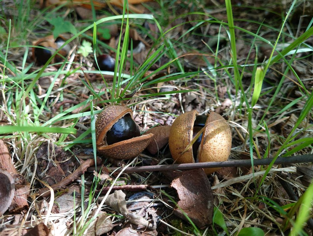 落下した果実(種子)は、げっ歯類:主にアカネズミに持ち去られ、落下後3週間ほどで消失するそうです(貯食活動)🐁