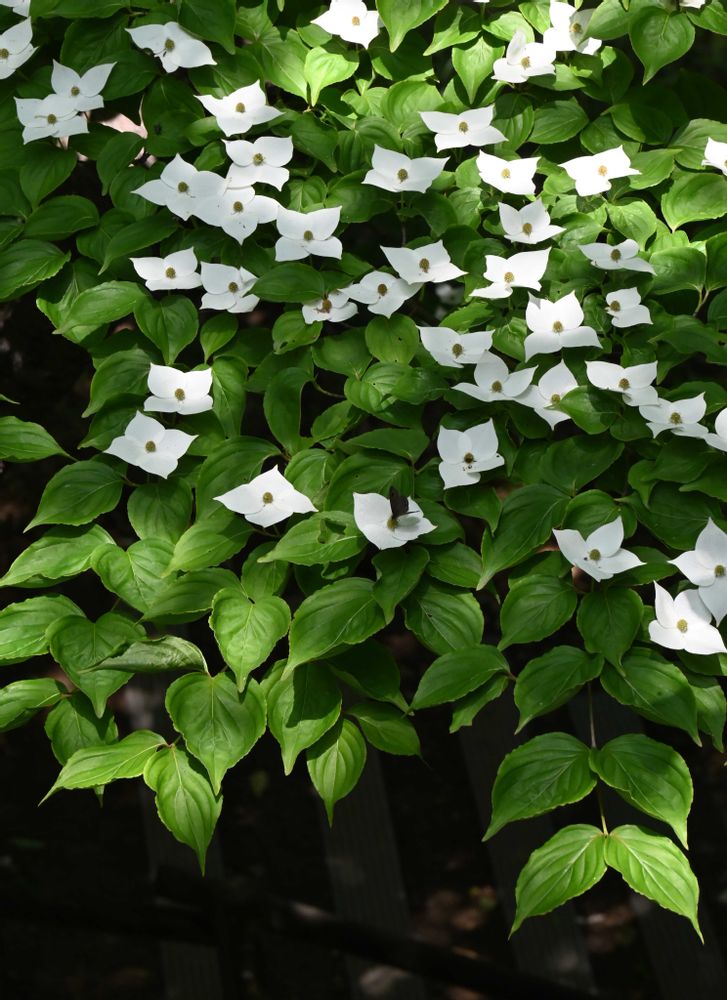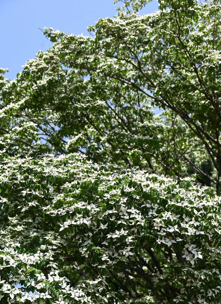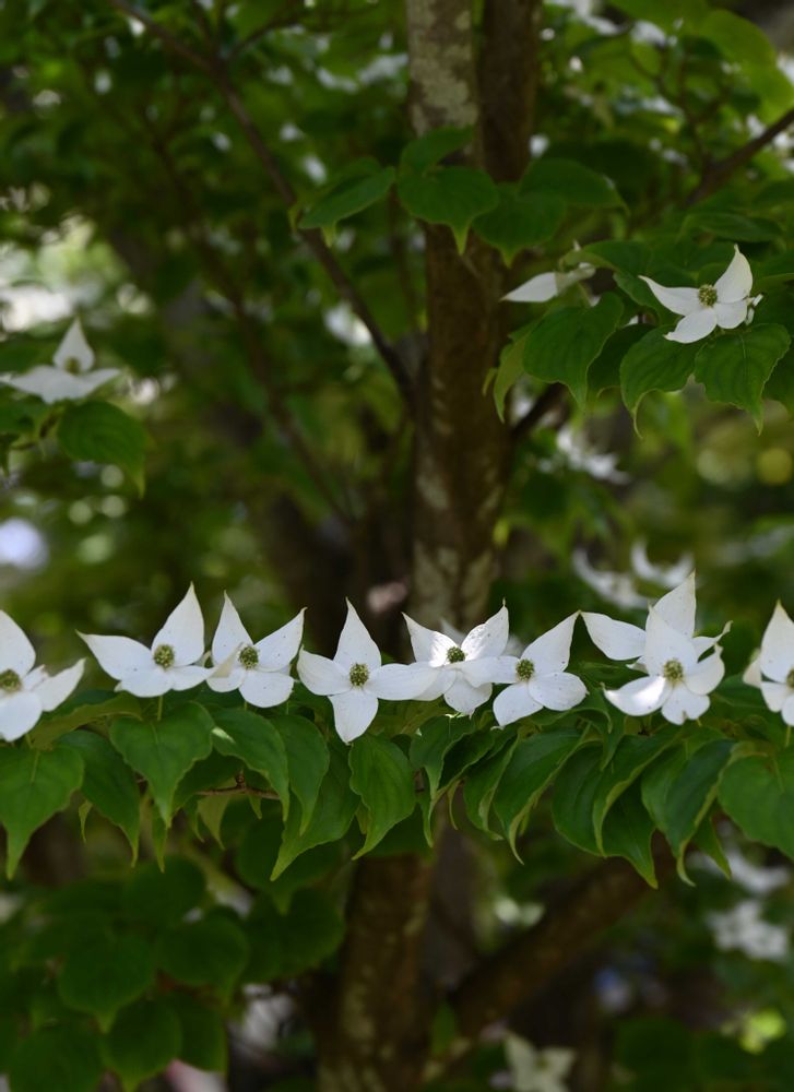 開花は近縁のハナミズキ(アメリカヤマボウシ)よりも遅く、葉が完全に開いてから、枝の先に上向きにまとまって多数の白い装飾花(実際は総苞)が上向きに咲く。