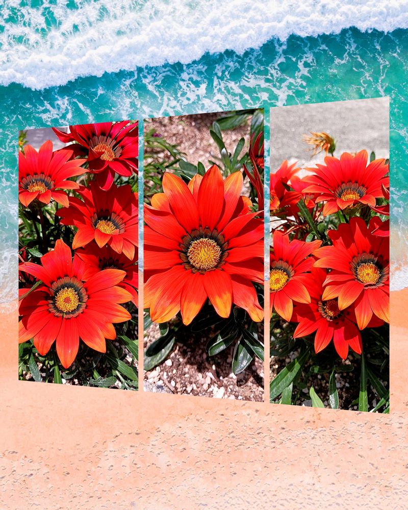 波と砂浜にガザニアさんの赤が素敵に映えて異国のようですね🥰✌️👍💕