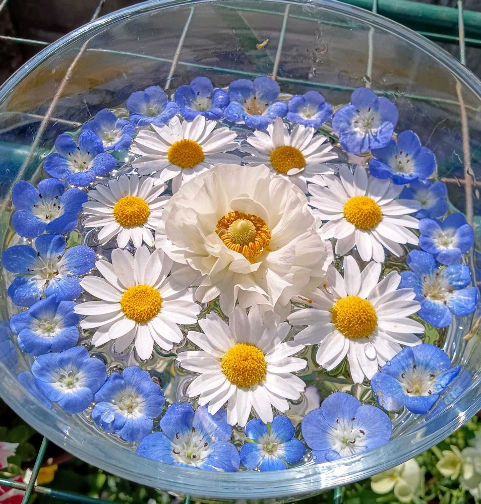 ネモフィラ🩵が終わってしまう前にカット✂️して花手水にしてみました😌