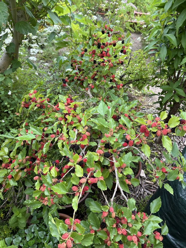 この桑の木、鉢で管理して たぶん15年以上になると思います。剪定したりで大きくならない様にしてましたが、土の上に直置きしたら根が伸びて…実も凄い事に!