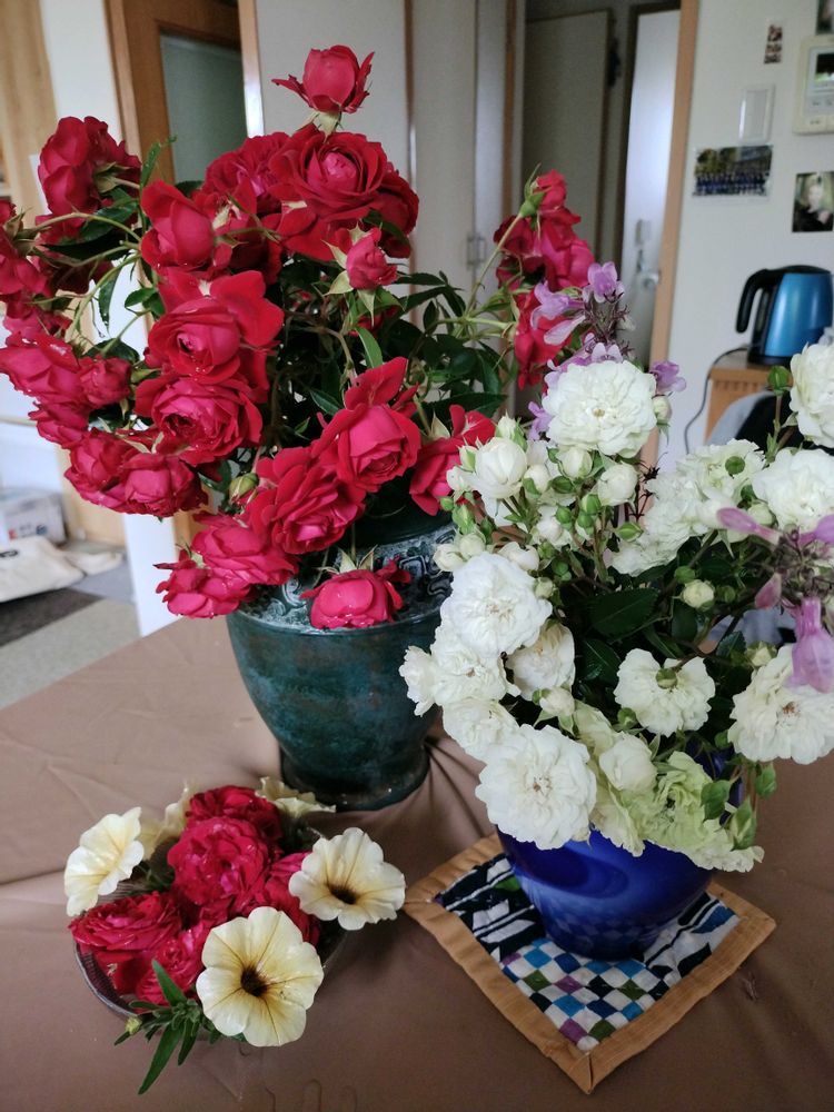 今日はミニバラやロベリア、色々切り戻したのでまだ散ってない花は花瓶に沢山!
