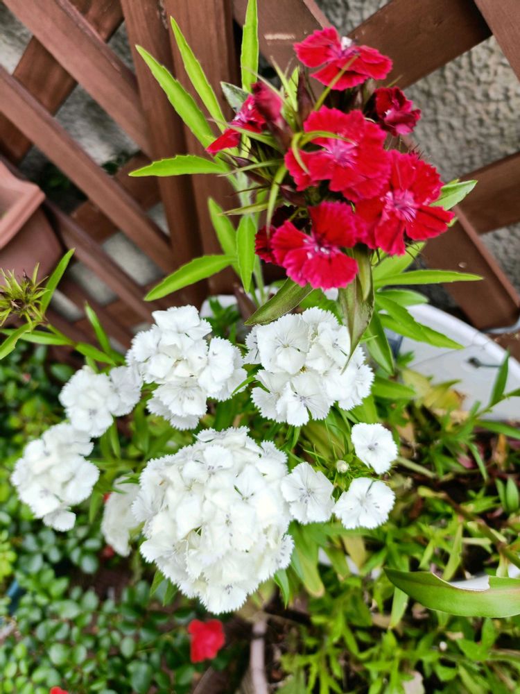 ①は、白い大きな八重咲きアマリリスに押されて、遠慮がちに見える赤いアマリリス😅