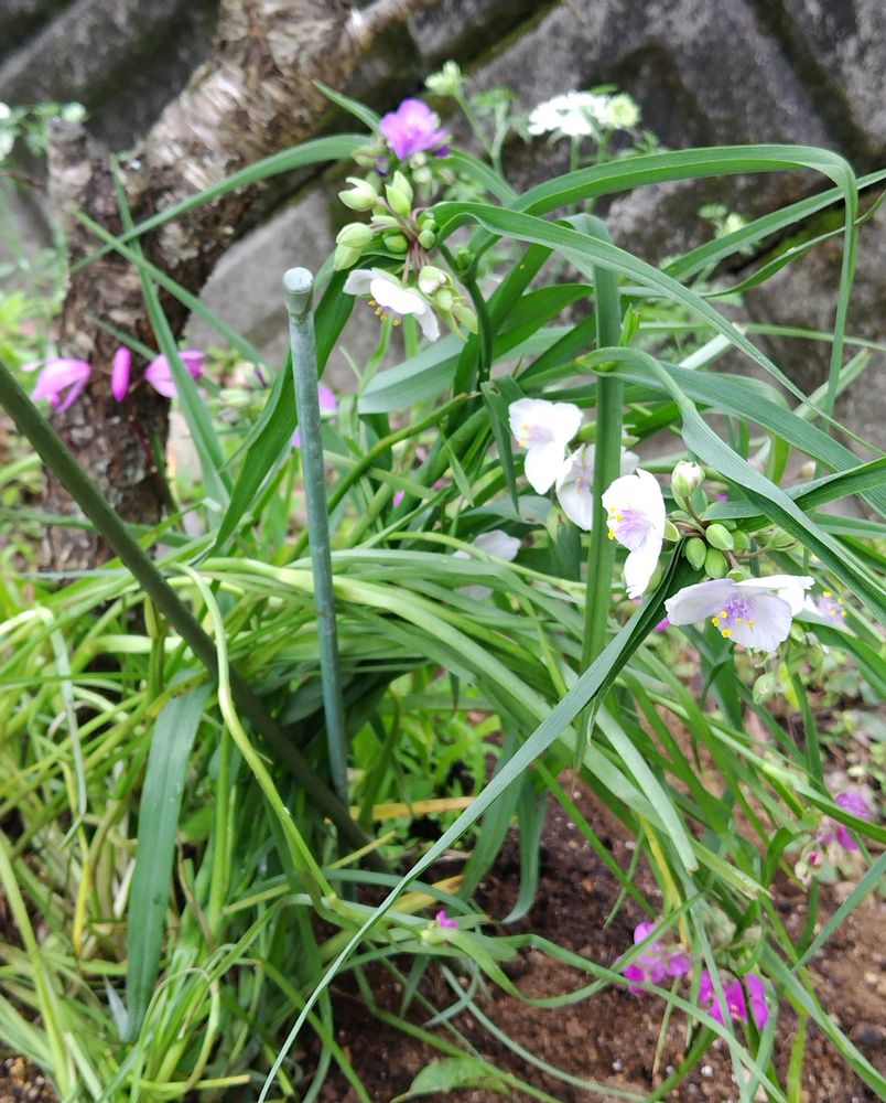 先日花友さんからいただいたピンク色と白色のムラサキツユクサを、ウチにあったムラサキツユクサや紫蘭と一緒に、花桃の足元に植えました🤗