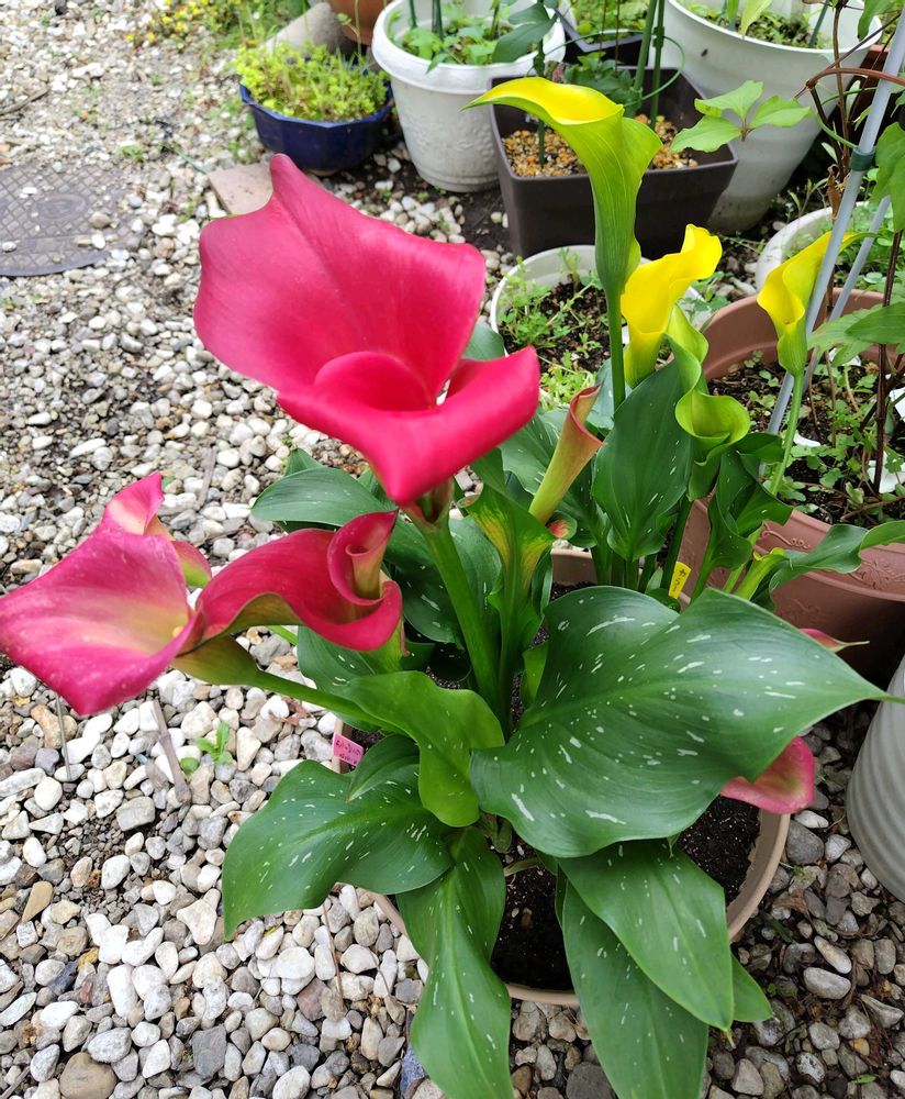 ①先日お迎えした2色のカラーを寄せ植えにしました💚💗💛💚