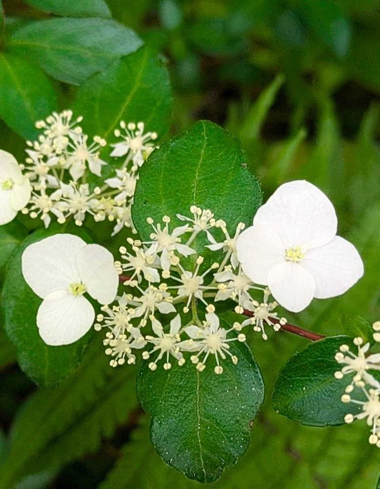 ②ガクウツギより花が小型で葉も小さく細長く縁に小さな鋸歯があって常緑の葉のように光沢があるそう🌿