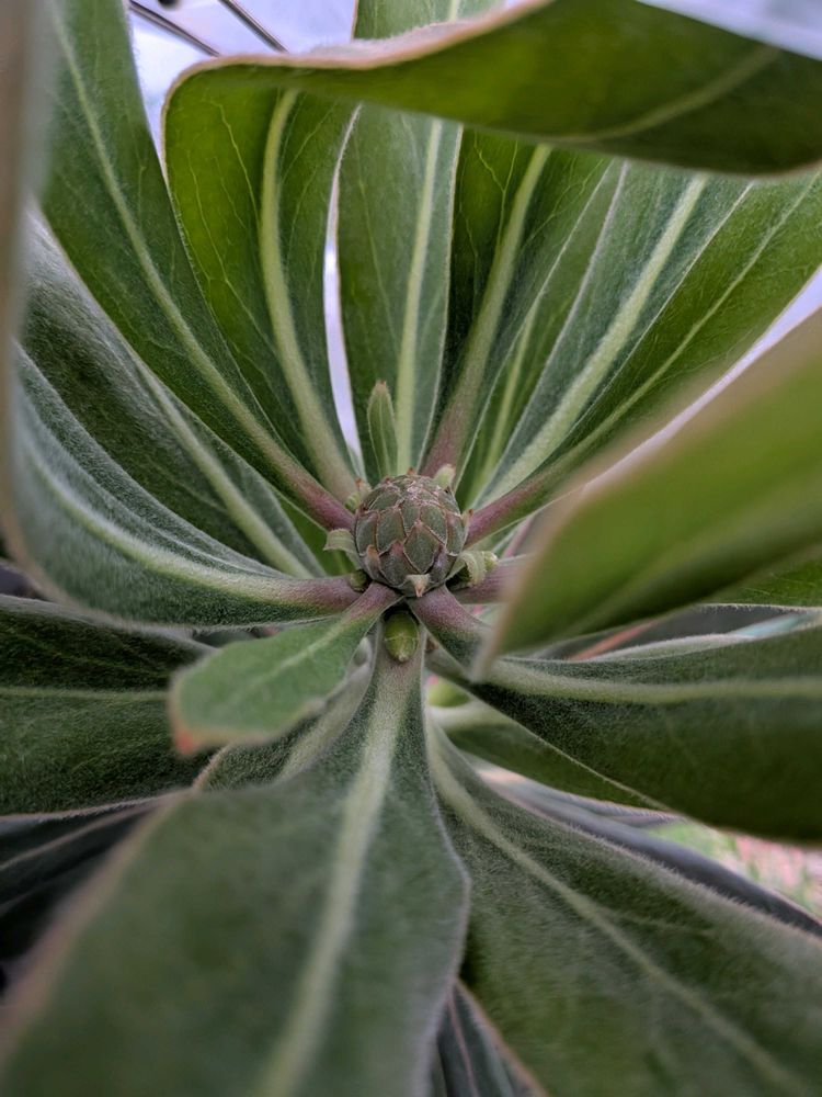 プロテアに蕾か葉芽か分からない新芽が。他の果樹にも蕾がついてきています。