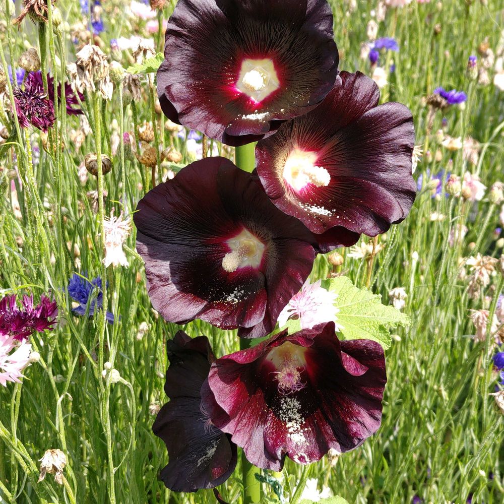 ①4月に色合いが好きでお迎えしたペチュニアさん2種類 ②以前投稿したアルセア(タチアオイ)ブラックナイト ③母の日に貰ったお嫁ちゃんチョイスのペンステモン④冬越しして咲き始めたチョコレートコスモス 似た色の花達を集めてみました