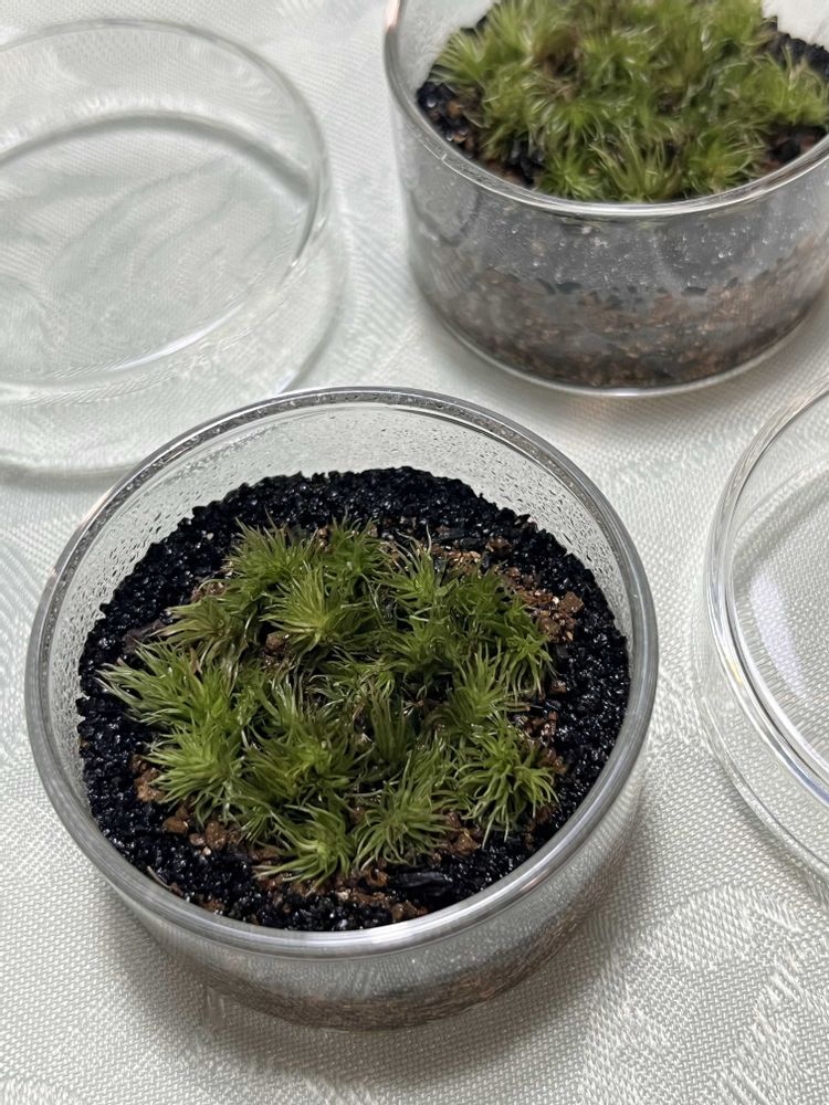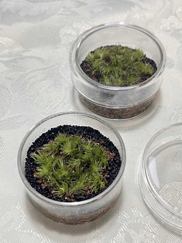 もともと我が家にあった小さいガラスケース(シャーレみたいな形)2個に分けて植え付けました