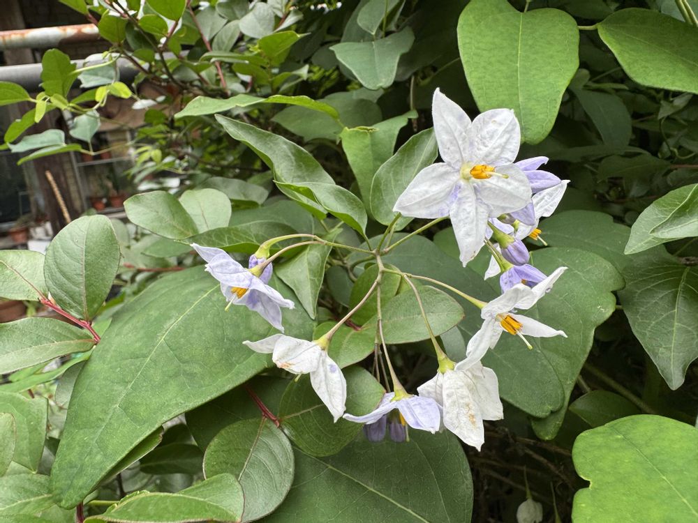 ツルハナナスはつる性の常緑低木で、トレリスなどに絡ませたり、あんどん仕立ての鉢物などにして楽しむことができます。花は咲き始めは白色ですが、徐々に薄青色に変化します。寒さにも比較的強く、海沿いの霜が降りないような暖地では戸外でもよく冬越しします。ヤマホロシの名でも流通することがありますが誤称で、ヤマホロシは日本原産の近縁種Solanum japonense の和名です。