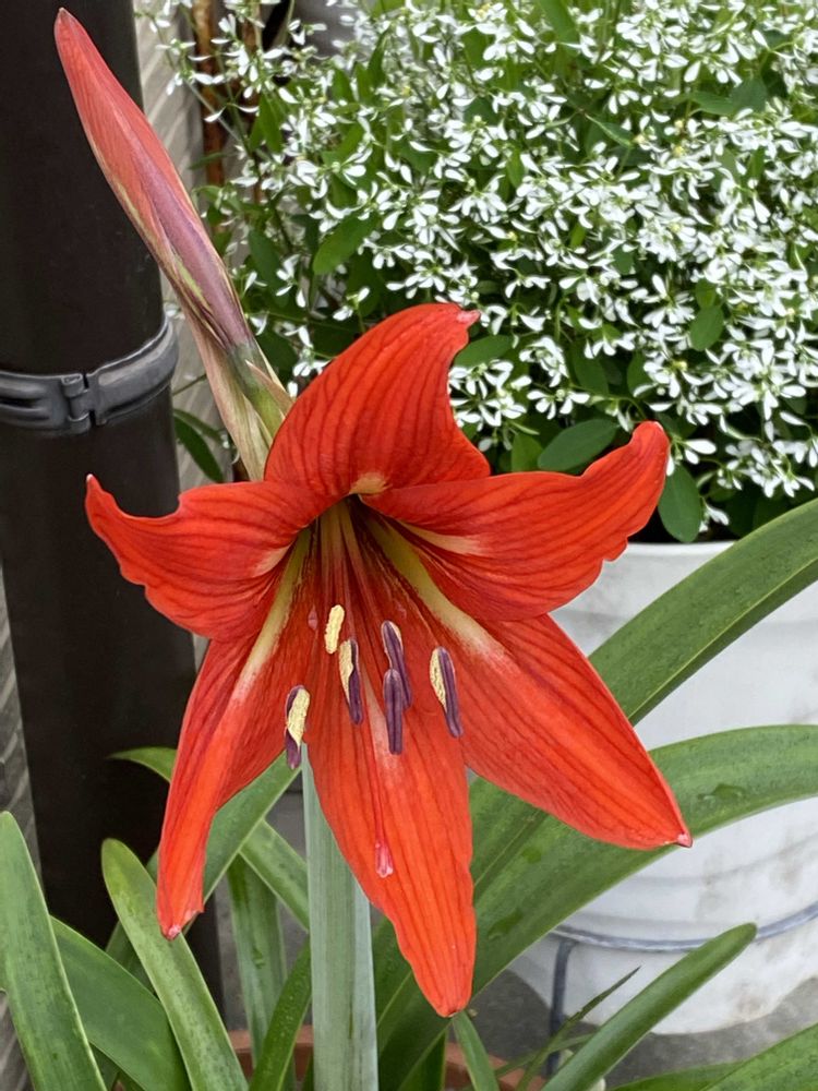 アマリリス咲きましたね🌺来年の楽しみが増えましたね🍀後ろの白いユーフォルビアとマッチして素敵💓