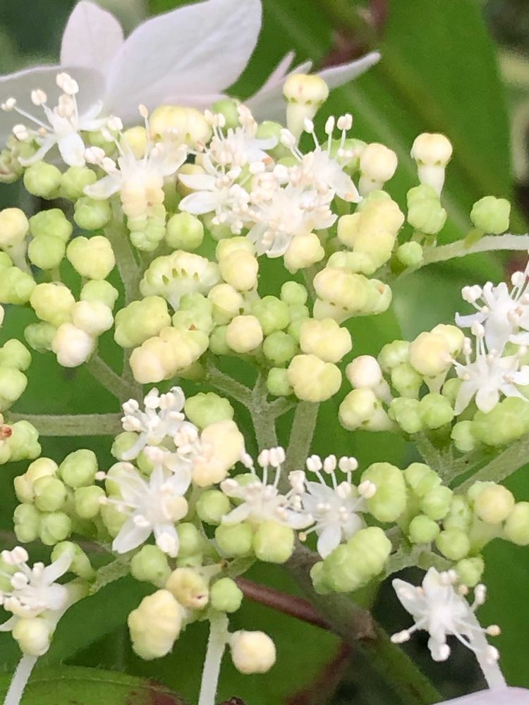 両性花、装飾花とも白色で、装飾花は不整形な八重花です🌿