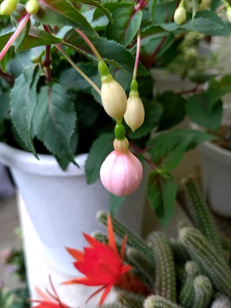 ちっちゃかった苗に蕾が付いて、ようやく膨らんできました😊💕間もなくパッカーンかな😍まん丸で可愛いです🥰下から白檀🌵が見守ってます😄❤️