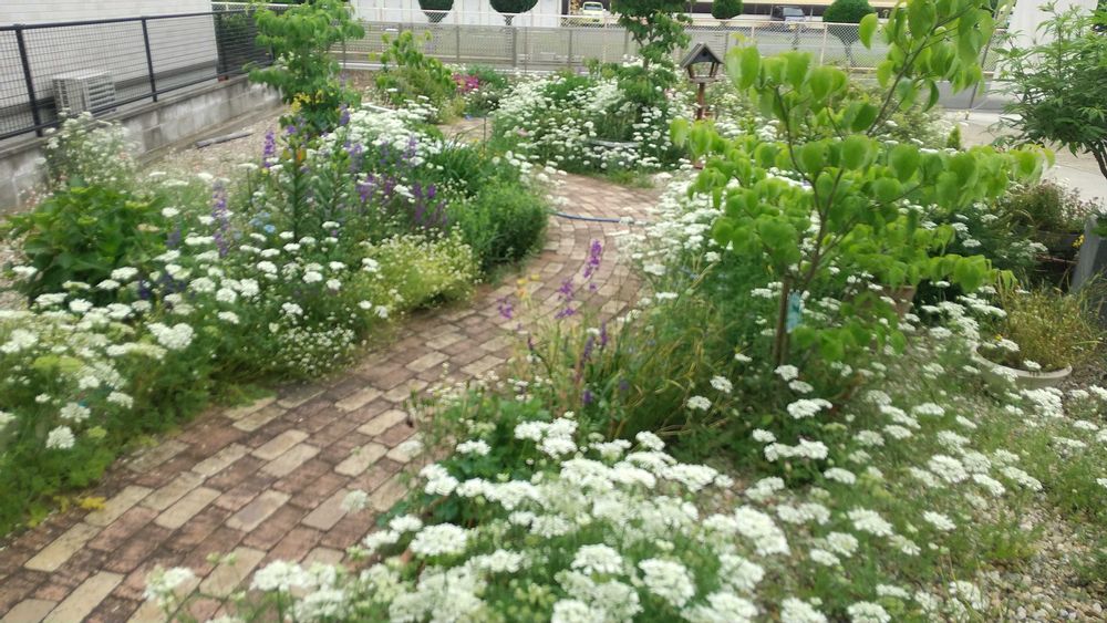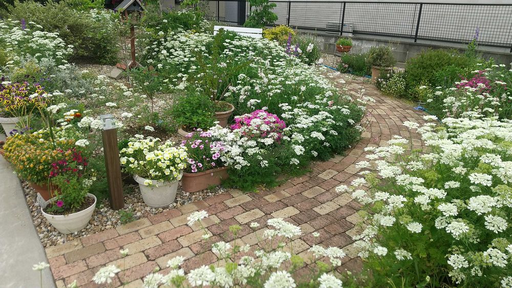 今日の我が家の庭。春からフリージア、ホメリア、カモミールなどが終わり、今はオルレアホワイトレースが真っ白に庭を埋めています。これは全てこぼれ種から咲きました。間に植えてあるブルーサルビアなどは目立たないほど。🤗😉💮🌼🌺