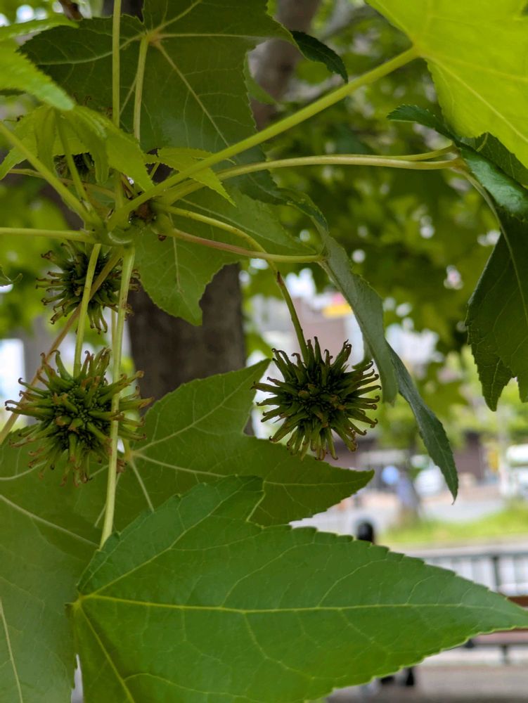 ③アメリカフウ別名 モミジバフウ フウ科 フウ属 花も実と同じく、緑のイガイガ これはまだ花かなー やはり花ですね。