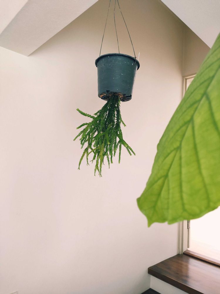 やってみたかったアレンジの1つ、フペルジアをスカイプランター式にしてみました😉と言っても鉢を逆さに吊るすのは難しかったので💦鉢底に穴を開けただけ😅