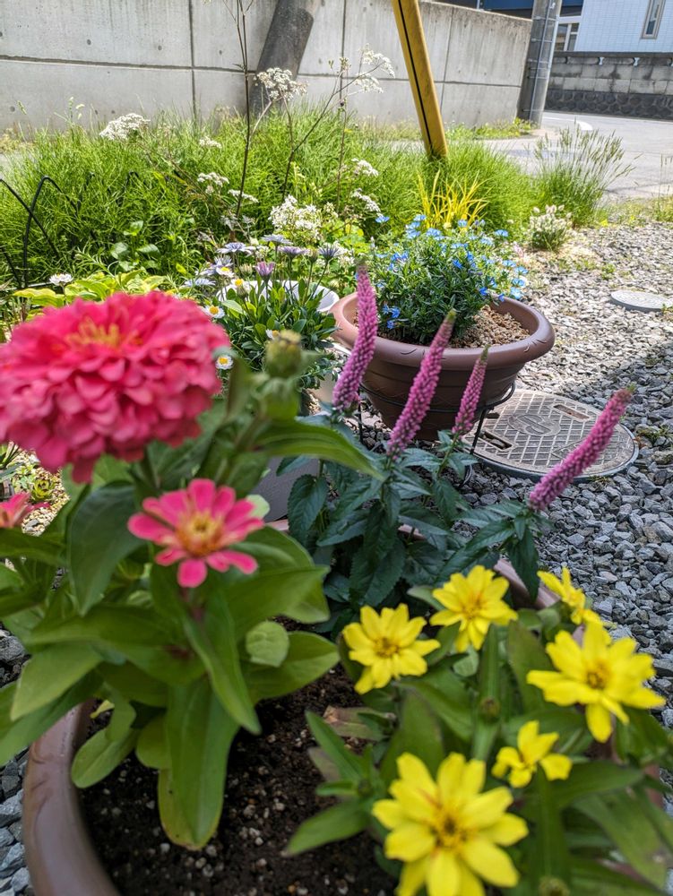 ジニアとベロニカ、寄植えにしました😊2枚目、ヒデンス💛地植えに!