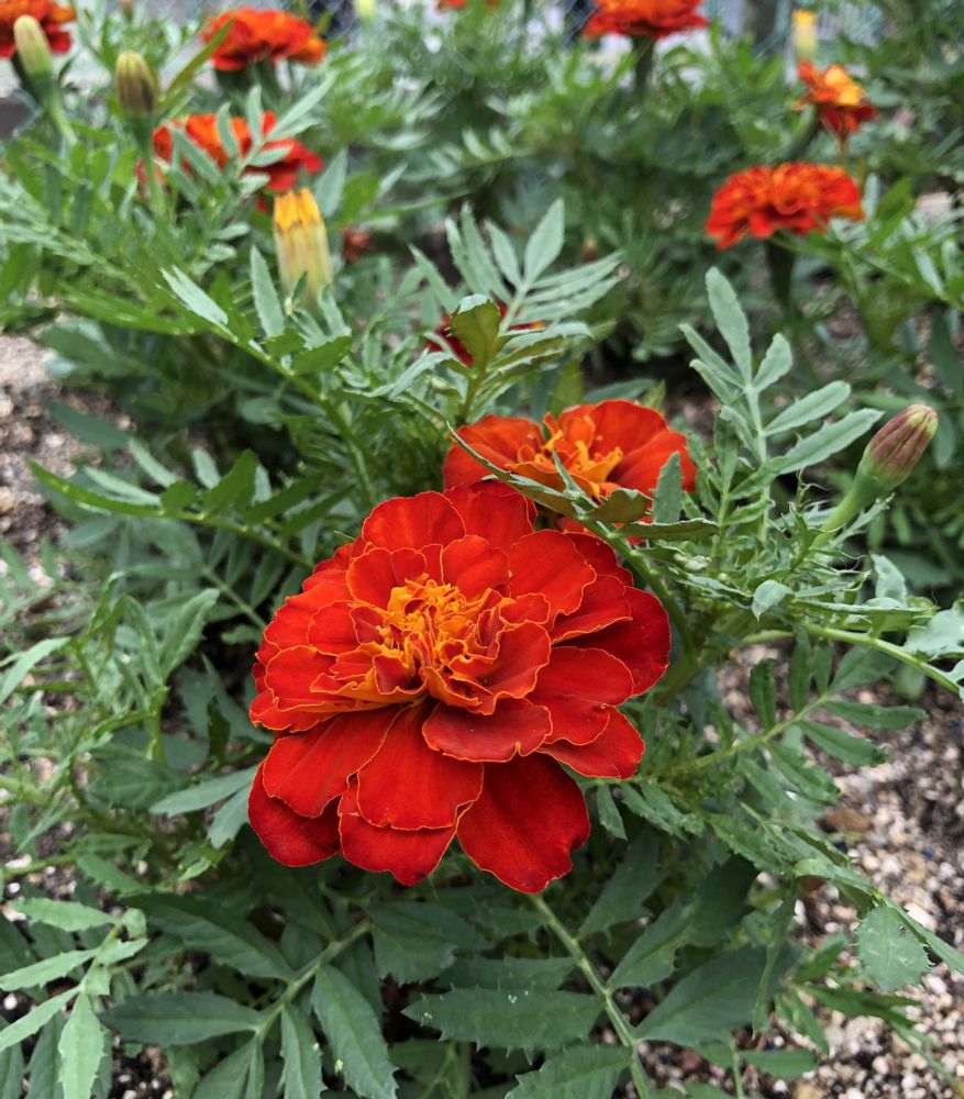 大きさも立派な見事な赤のマリーゴールドですね。美しいです。